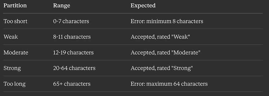 PartitionTest Value (length)Example PasswordToo short4 charsAb1!Weak10 charsAbcde12!fgModerate15 charsAbcdefgh12!jklmStrong40 charsAbcdefghijklmnop12!rstuvwxyz1234567890AbToo long70 chars(70-character string with valid composition)