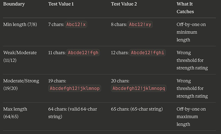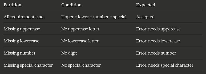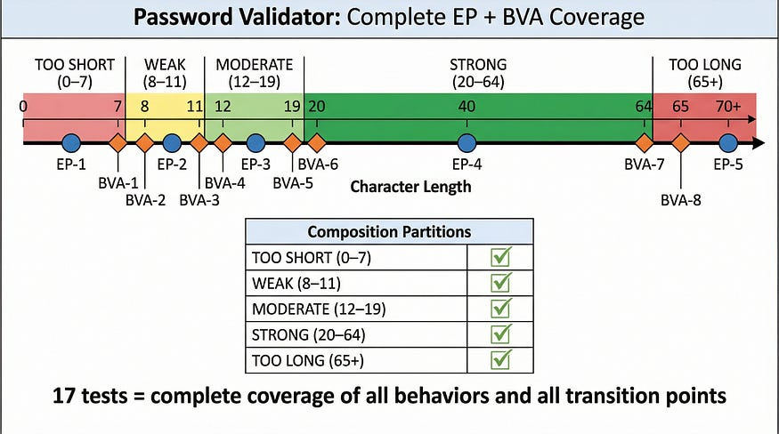 TOTAL: 17 test cases (9 EP + 8 BVA)Seventeen tests cover every partition and every boundary of a moderately complex password validator. Without these techniques, a tester might write 30 tests and still miss the boundary between “Moderate” and “Strong” ratings — or they might write 10 tests and coincidentally cover some boundaries but miss entire partitions.