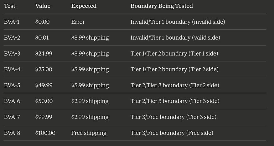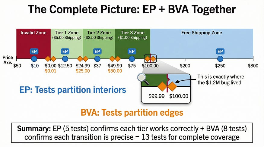 Compare this to the opening story: if that team had applied BVA to their free shipping boundary, they’d have tested $99.99, $100.00, and $100.01. The > vs >= bug would have been caught in minutes, not discovered by 14,000 angry customers.