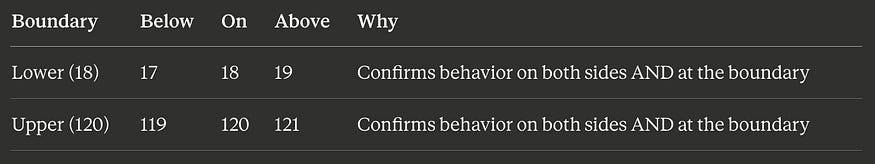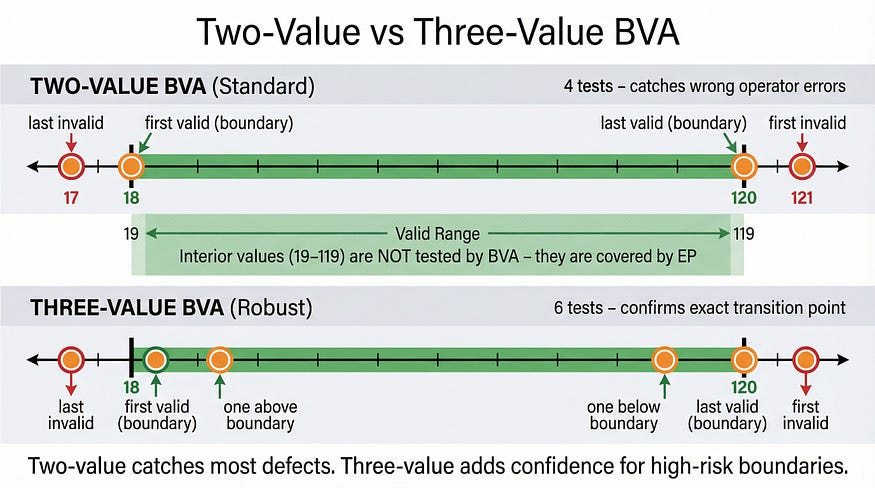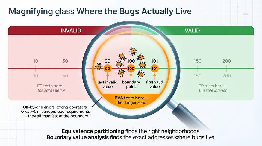 This is the core principle: boundary values have disproportionate defect-detection power compared to interior values. A single test at a boundary is worth more than dozens of tests in the partition’s interior.