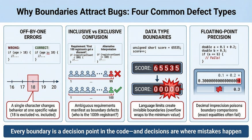 The most common boundary defect. The developer means “18 or older” but writes age > 18 (which excludes 18) instead of age >= 18 (which includes it). These errors are pervasive because the difference between >, >=, <, and <= is subtle, easy to mix up, and often not caught by code review.