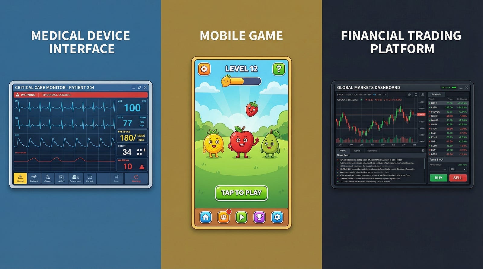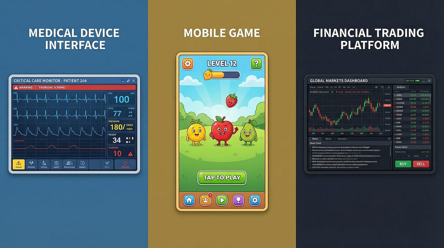 Financial trading systems handle billions of dollars flowing through markets. Bugs can cause financial crises — remember the Knight Capital trading glitch that lost $440 million in forty-five minutes? These systems need exhaustive testing of calculations, extensive security testing, and rigorous disaster recovery testing. But they don’t need the same documentation as medical devices because regulators care more about having proper controls than about seeing every test case.