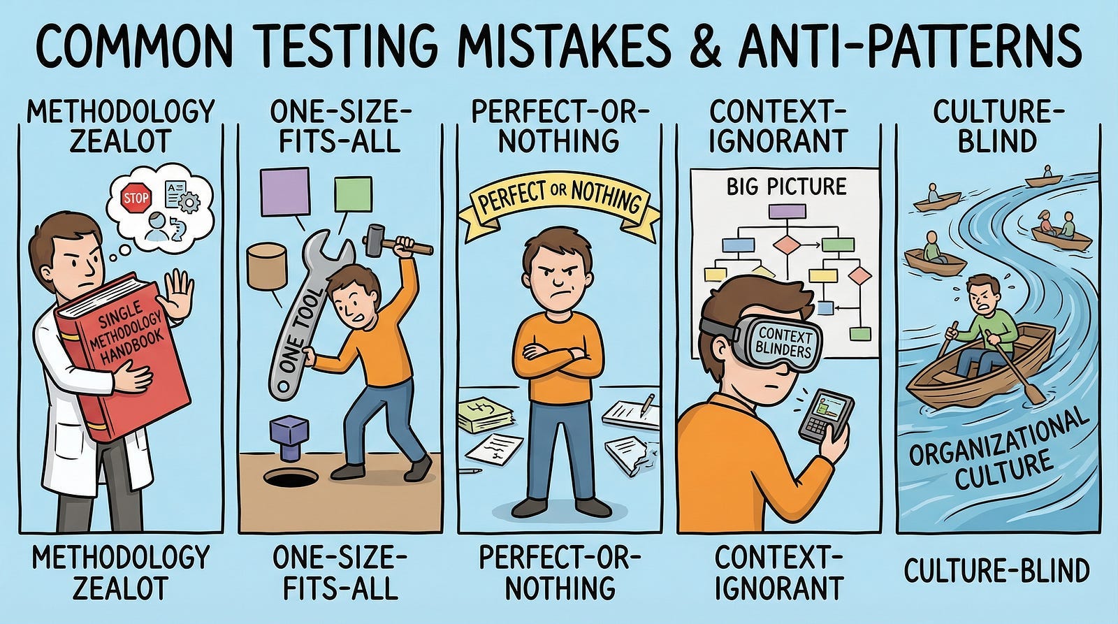 The testing approach that’s perfect for one context might be disastrous for another. The methodology that worked brilliantly on your last project might fail completely on this one if the context is different.