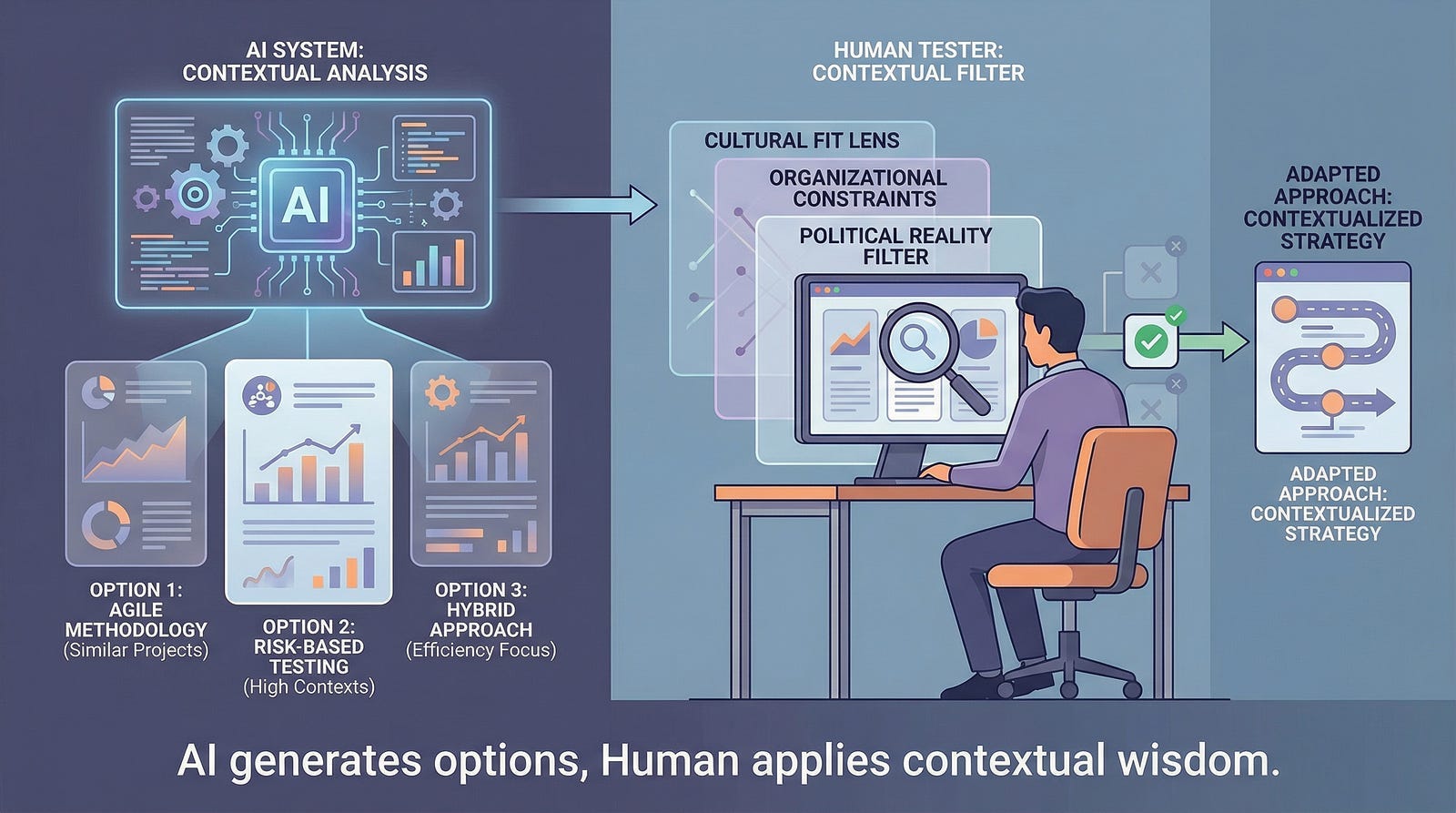 AI excels at pattern matching and can quickly identify similar projects to yours. It can suggest testing approaches that worked in comparable contexts. It can analyze your project characteristics and recommend relevant techniques. This accelerates the context assessment process.