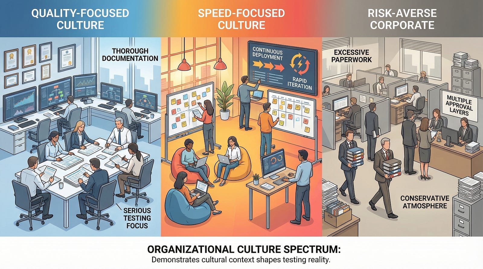 Risk-averse cultures test everything extensively because they fear mistakes. Sometimes this is justified by context — highly regulated industries, critical infrastructure, sensitive data. Sometimes it’s organizational paranoia creating unnecessary process. Testers in risk-averse cultures must balance thoroughness with efficiency, helping the organization test appropriately without over-testing to satisfy anxiety.
