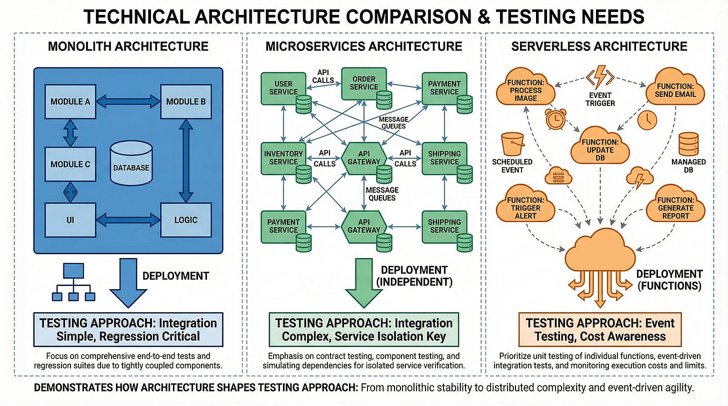 Real-time systems need timing and latency testing that batch systems don’t. Embedded systems have resource constraints that cloud applications never face. Distributed databases have consistency challenges that single-database systems don’t encounter.