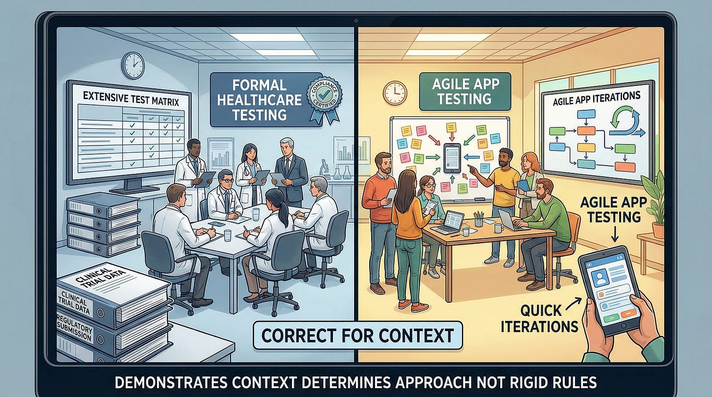 Context shapes how much risk is acceptable. This connects directly to our earlier articles on risk-based testing, but context determines what “acceptable risk” means.