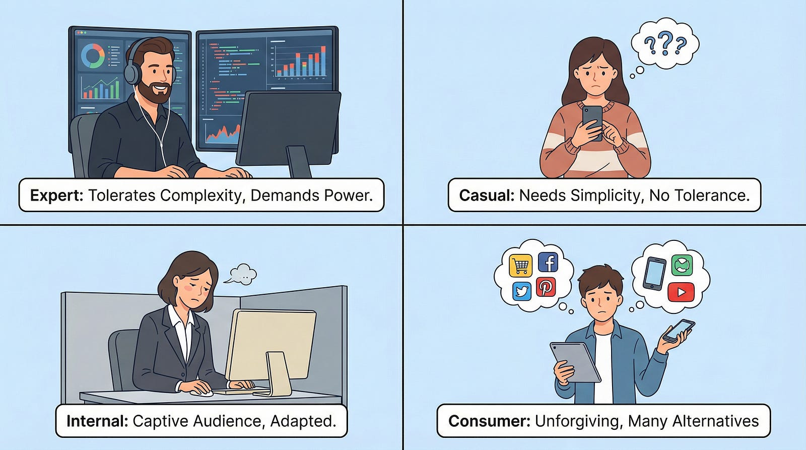 Internal corporate users are a captive audience. They have to use your software whether they like it or not. This doesn’t mean quality doesn’t matter, but it changes priorities. Training can compensate for complexity. Documentation can explain workarounds. Bugs can be tolerated if they don’t block critical business functions. The political context matters more than the technical context — who has power to demand changes, whose complaints carry weight, which departments are most influential.
