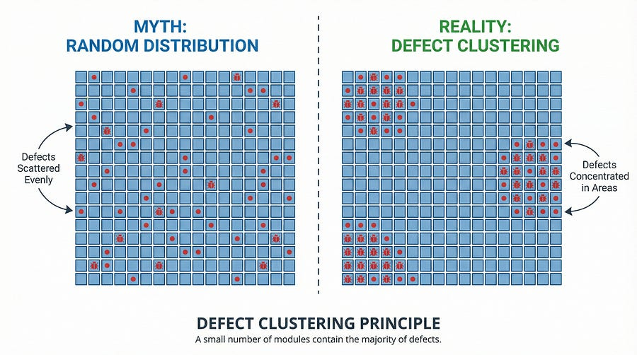 The phenomenon of defect clustering is often called the Pareto Principle or the 80/20 rule when applied to software quality. The concept is simple but profound: approximately 80% of defects are found in 20% of modules.