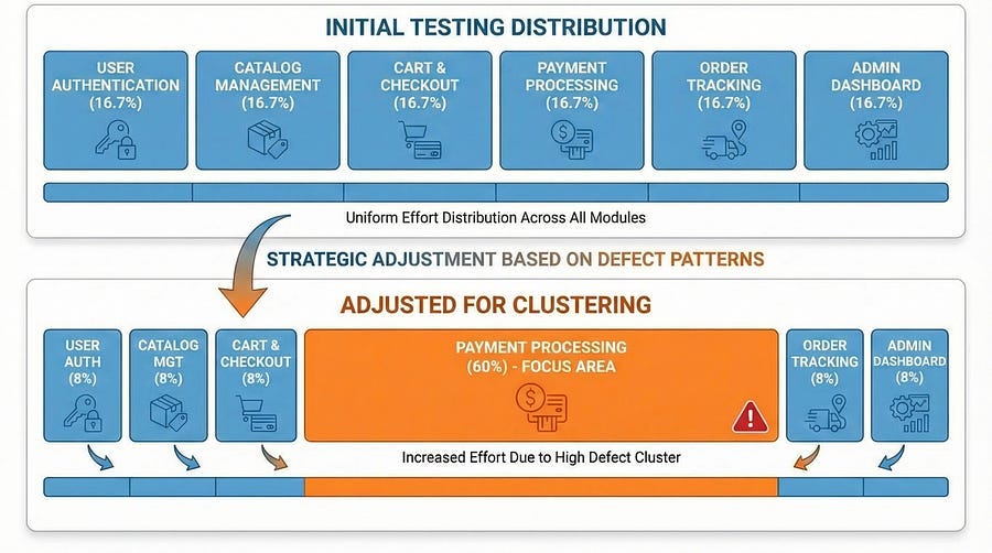 Defect clustering directly enhances the risk-based testing approach we discussed in the previous article. Historical defect data becomes one of your strongest predictors of future defects.