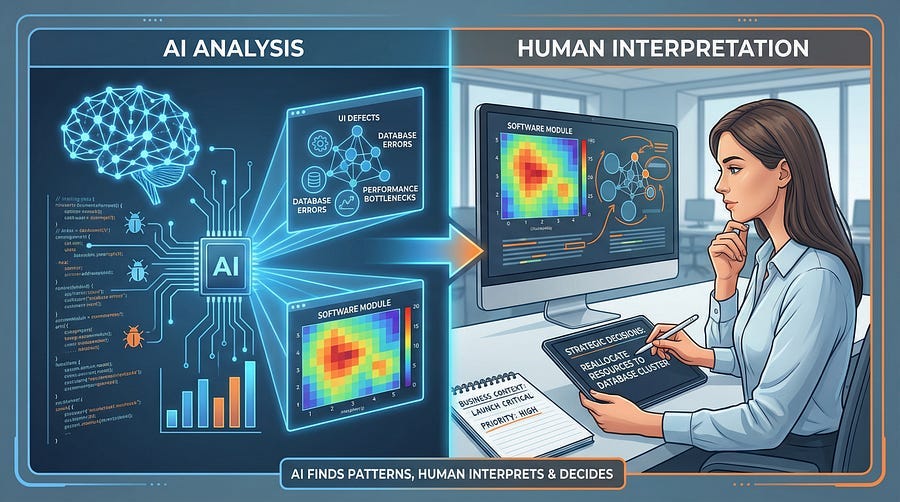 However, AI cannot understand context the way humans can. It might identify a statistical cluster that’s meaningless — perhaps a module has many low-severity cosmetic issues that don’t matter while another module has three critical security flaws that matter enormously. AI sees quantities but struggles with quality and context.