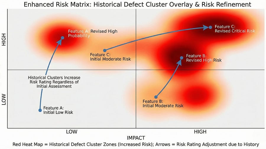 Create a risk multiplier based on historical clustering. A feature assessed as medium risk that’s in a known defect cluster area might be elevated to high risk. A feature assessed as high risk that’s in a historically clean area might stay high risk but require less testing than a high-risk feature in a cluster zone.