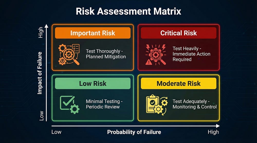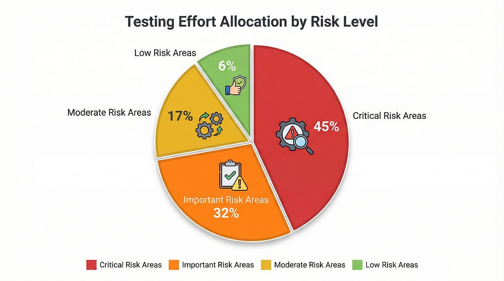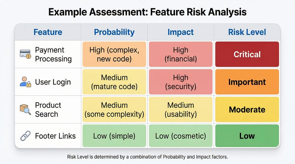To Stakeholders: “We’re focusing 50% of testing effort on payment processing because it’s high complexity, handles money, and has regulatory requirements. The footer links will receive minimal testing — automated smoke tests only — because they’re low complexity and low impact. Here’s our complete risk assessment…”