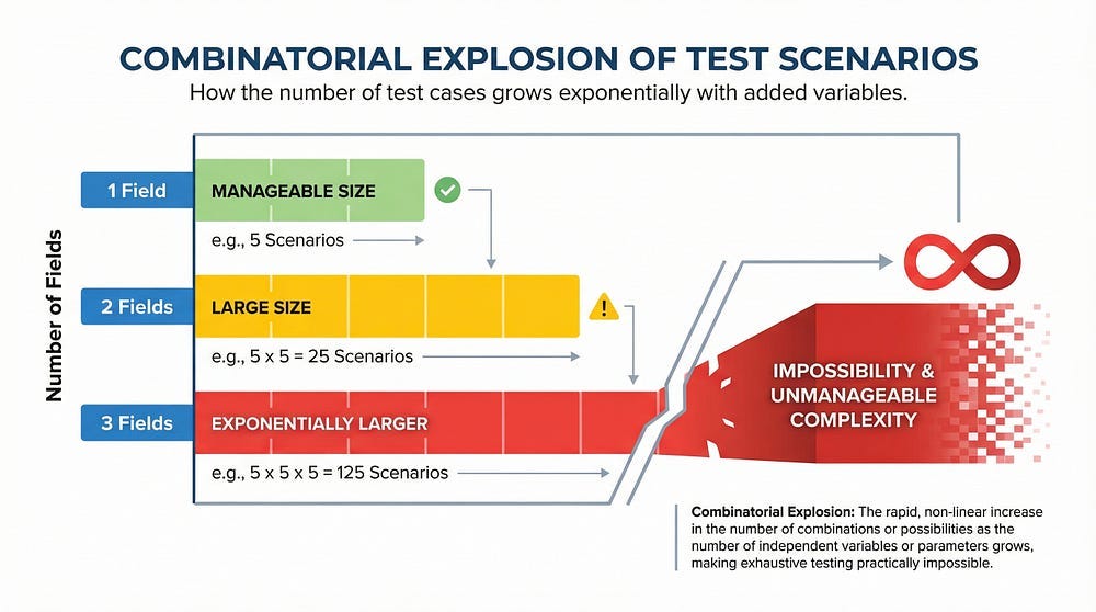 When you combine multiple inputs or conditions, possibilities multiply exponentially rather than additively. Two yes/no options create four combinations. Five yes/no options jump to thirty-two combinations. Ten yes/no options explode to 1,024 combinations. Twenty yes/no options reach over one million combinations. Real applications have hundreds or thousands of decision points, creating combinations that dwarf these numbers.