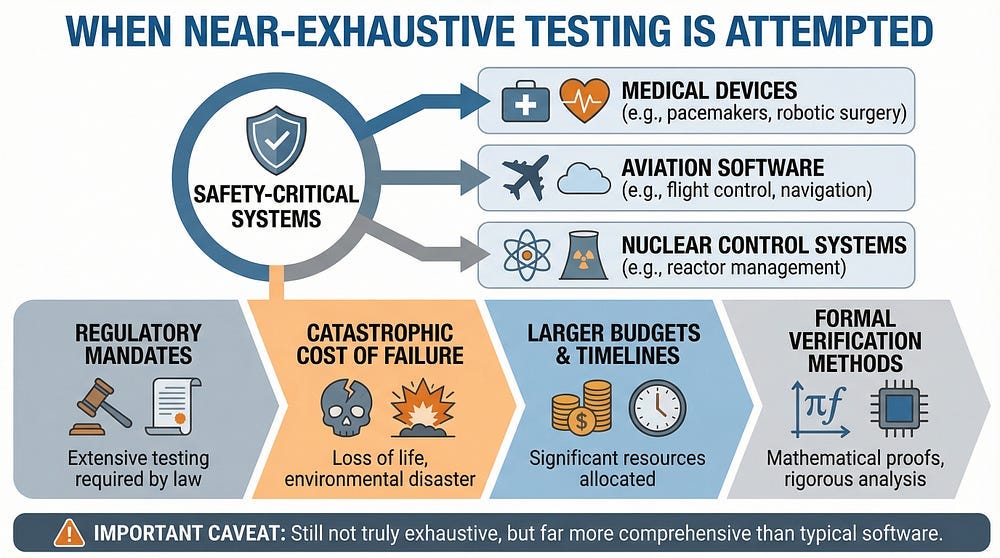 It’s not just about math. There are multiple practical reasons why exhaustive testing can never be achieved.
