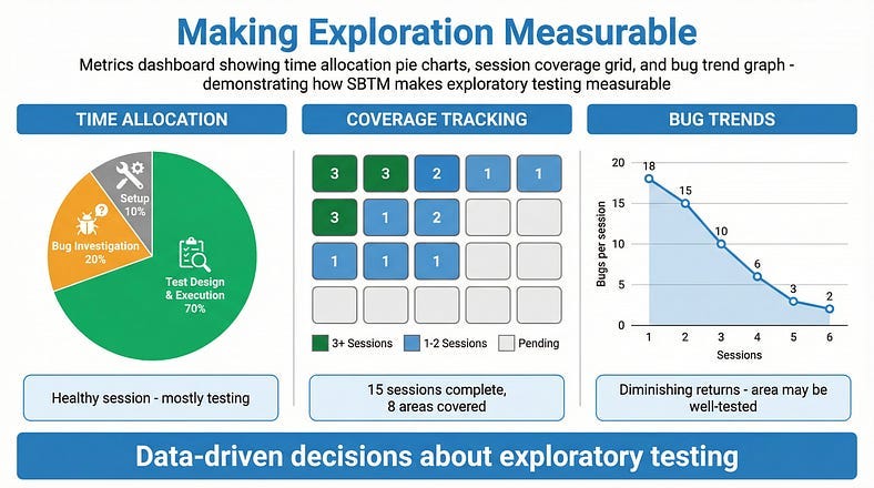 SBTM transforms exploratory testing from untracked activity into a managed practice. But the framework is means to an end, not an end itself.