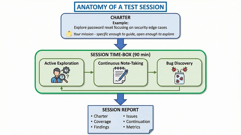 A session is the atomic unit of SBTM. Understanding its structure is essential.