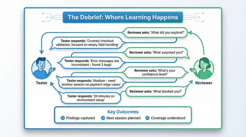A debrief is a conversation between the tester and a reviewer (often a test lead or manager) about what happened in the session. It’s not an interrogation or status check — it’s a collaborative discussion that benefits both parties.