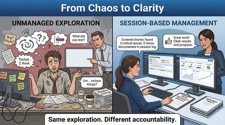 This is the accountability problem with exploratory testing. When testing is unscripted, how do you track what’s been done? How do you report progress? How do you know when you’re finished? How do you coordinate multiple testers without duplicating effort or leaving gaps?