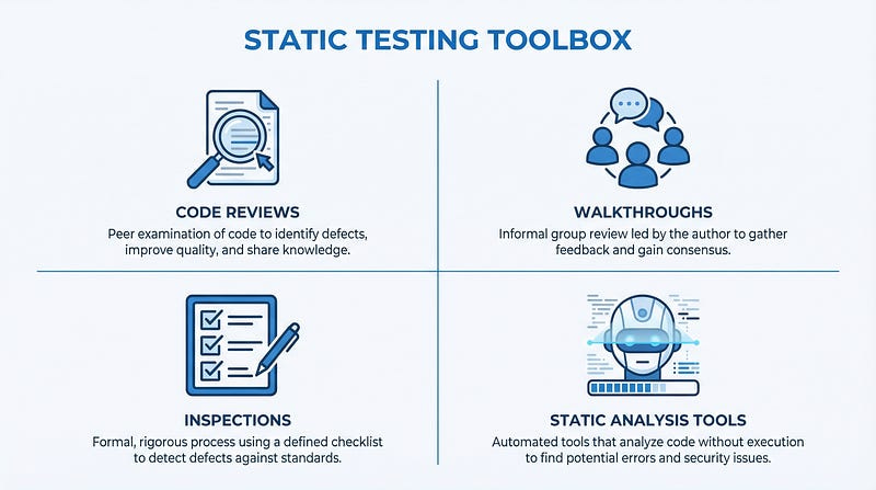Static testing examines software artifacts without executing the code. Think of it like a building inspector reviewing blueprints before construction begins — they’re looking for structural issues, code violations, and design flaws on paper.