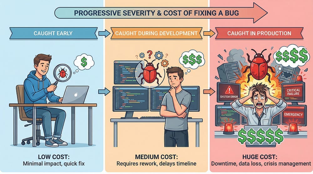 This isn’t just theory — it’s economics. The timing of when you find and fix defects has a dramatic impact on cost, schedule, and product quality. Understanding this principle will change how you approach testing throughout your career.