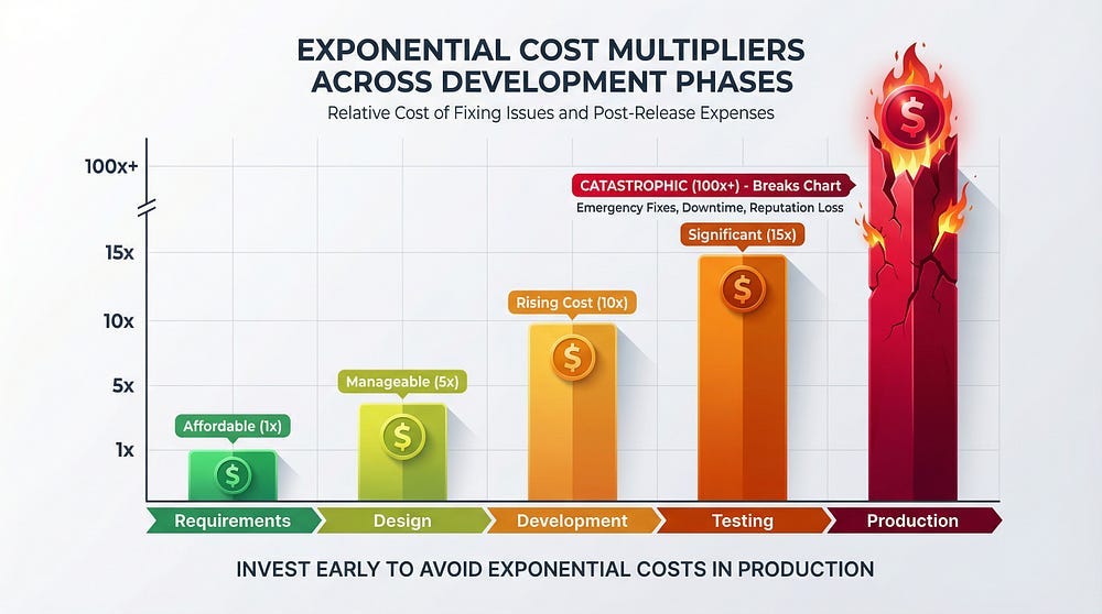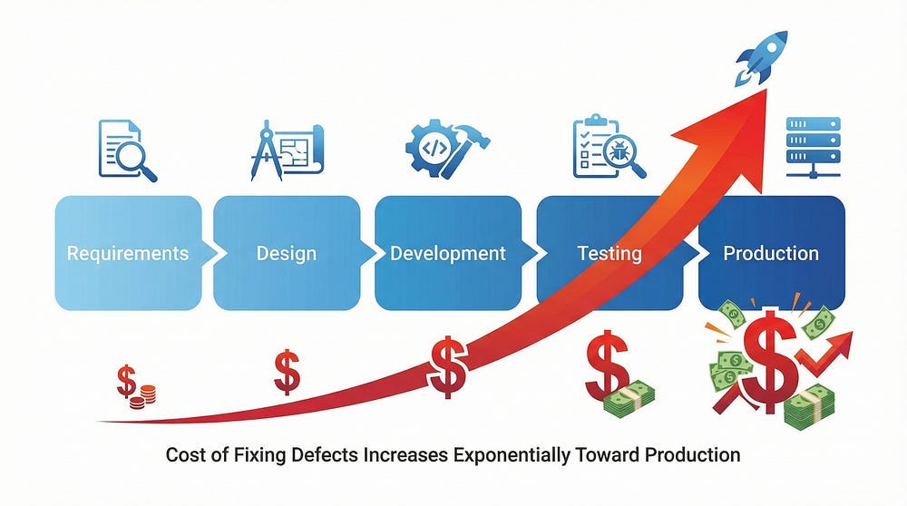 Early defects are found during calm planning phases. Production defects create panic, rushed fixes, and compounding errors.