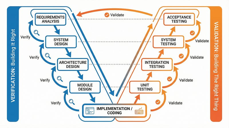 If you want to see verification and validation in perfect architectural form, look at the V-Model — a software development approach that pairs each development phase with a corresponding testing phase.