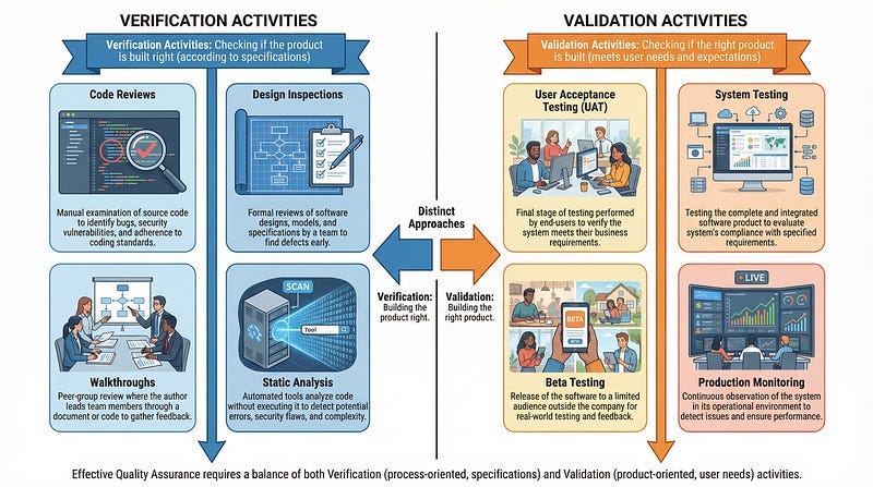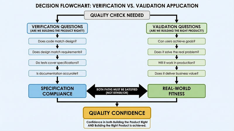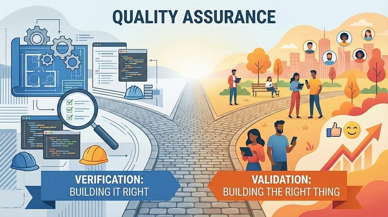 Verification and validation are two lenses for examining quality. Verification asks whether you followed the plan. Validation asks whether the plan was right.