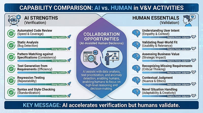 The “trust but verify” principle becomes crucial: Use AI to accelerate verification activities, but maintain human judgment for validation activities. AI can help you build it right. Only humans can determine if you’re building the right thing.