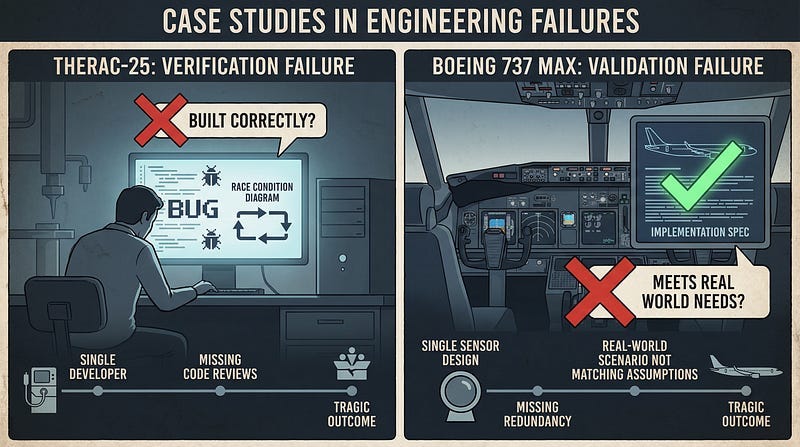 The Mars Climate Orbiter followed its plan perfectly into the wrong trajectory. The Boeing 737 MAX MCAS executed its design flawlessly into disaster. These weren’t failures of execution — they were failures of validation. The specifications themselves were wrong, and no amount of verification against wrong specifications can make a product right.