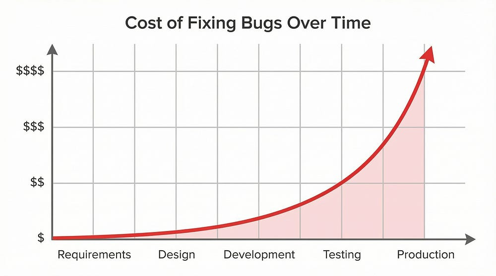 The cost of defects increases over time. A bug found during development might take an hour to fix. The same bug found in production could cost thousands of dollars and damage your company’s reputation.