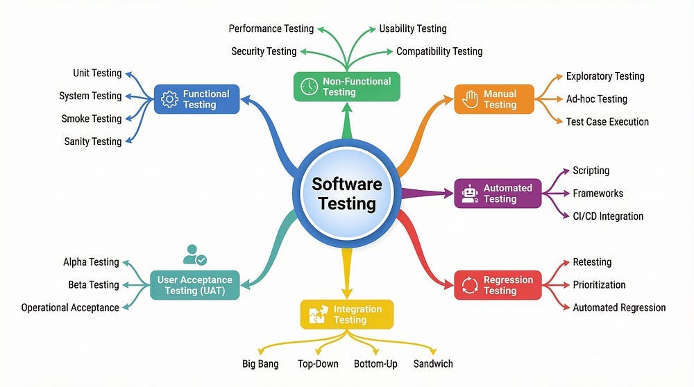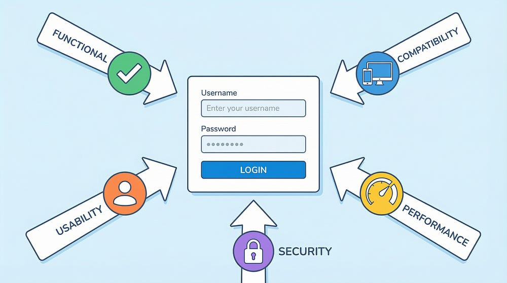 Software testing encompasses many specialized areas. Don’t worry — we’ll cover all of these in detail throughout this series. For now, here’s a brief overview: