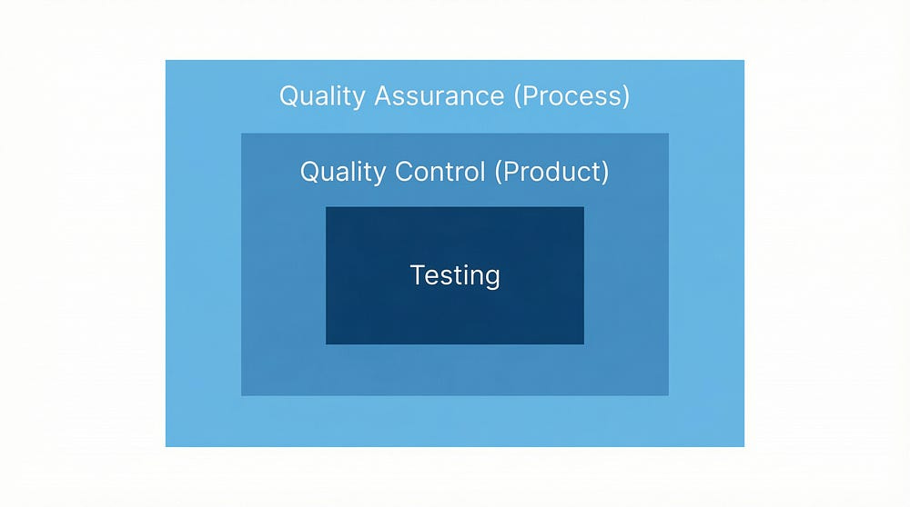 Think of it this way: QA is like training chefs properly and establishing kitchen standards. QC is like tasting the food before it goes to customers. Testing is the specific act of tasting and evaluating.