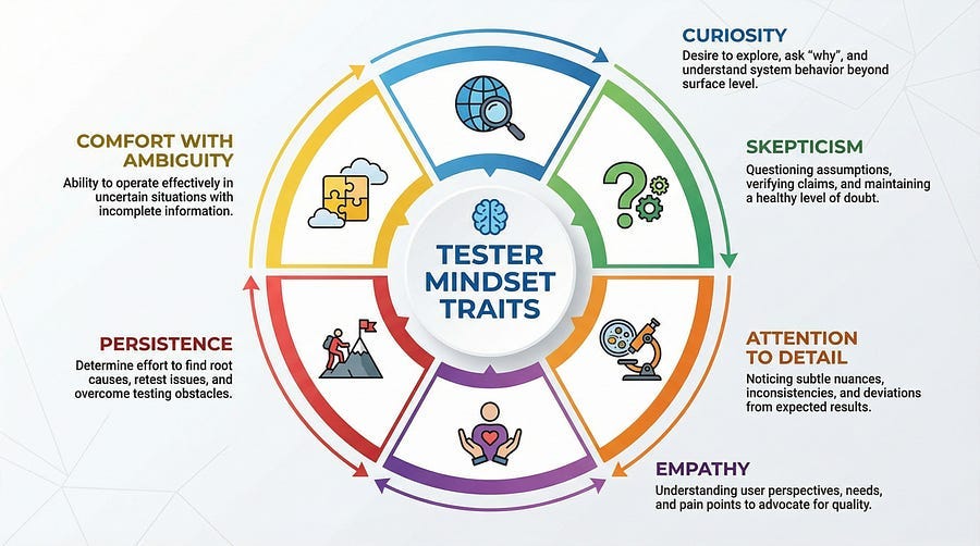 Skills can be learned, but mindset is different. These are ways of thinking and approaching the world that make testing feel natural. Some people have these traits instinctively. Others develop them through deliberate practice. Either way, they’re essential.